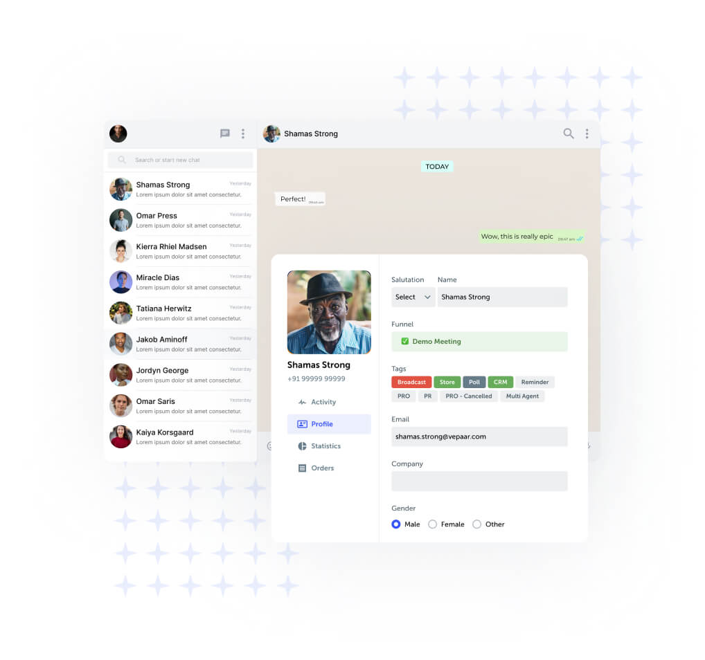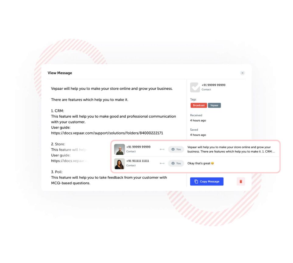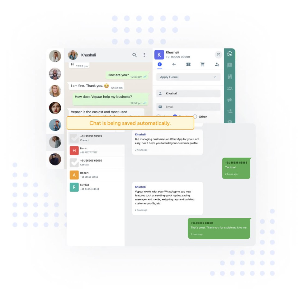 Vepaar helps take your business to the next level by automating many aspects of your business workflow with CRM-like features. We allow you to build customer profiles, send customized replies, save media, conduct polls on WhatsApp, start your online business, and a lot more.